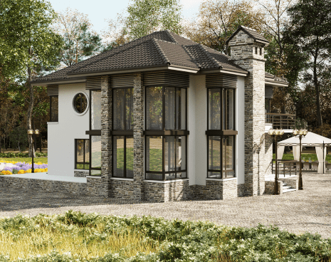 Подходит для просторных домов с красивым видом из окон. Большие стеклянные поверхности зрительно увеличивают пространство, наполняя дом светом.