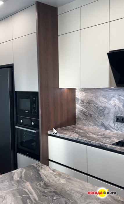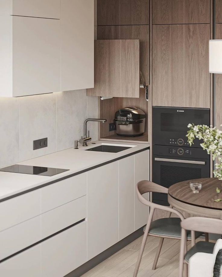 Минимум визуального шума на кухне, а откидная дверца обеспечивает быстрый доступ к приборам.