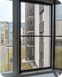 Для балконной двери сетка устанавливается в дверной проем. Крепится на дверные шарниры,
