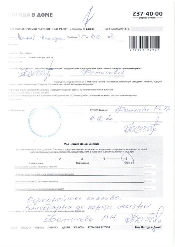 Благодарю компанию и сотрудников за проделанную работу. В частности хочу отметить мастера Пшеницина Сергея Николаевича. Сделал всё чисто, красиво! Потолком очень довольны!